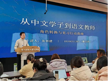 张林建老师曾任东北师大附中班主任、备课组长,现任学校办公室副主任,具备丰富的教学经验。在报告会中,张林建老师系统分享了关于教师角色认知转变、教学技能训练、见习期的成长路径等方面的见解,还深入讲解了语文教师的备课内功。本次报告会让同学们深刻认识到,要完成从学生到教师的角色转换,认知转变是前提,技能转换是核心,关系重塑是保障,而持续地反思则是不断成长的动力。